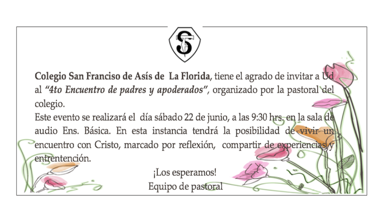 Colegio San Francisco de Asís de La Florida, tiene el agrado de invitar a Ud. al "Encuentro de padres y apoderados".organizado por la pastoral del colegio. Este evento se realizará el día sábado 14 de abril a las 09:00 hrs. en nuestro colegio...